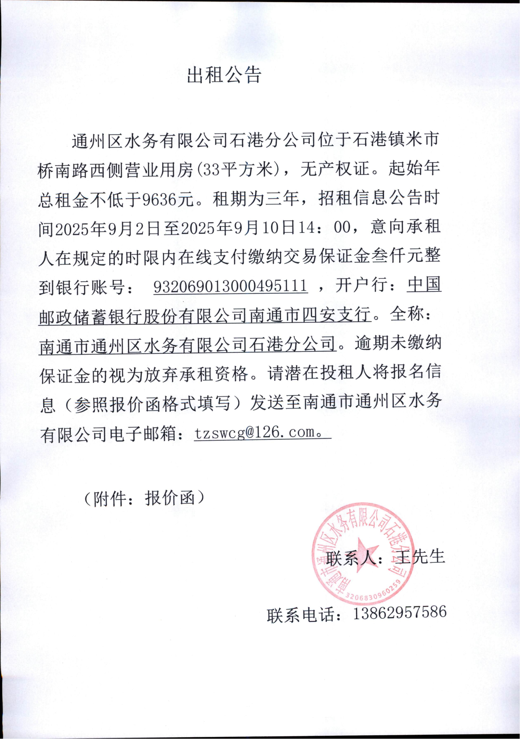 • 南通市通州區(qū)水務(wù)有限公司石港分公司米市橋南路西側(cè)營(yíng)業(yè)用房(33平方米)出租公告2025-09-01